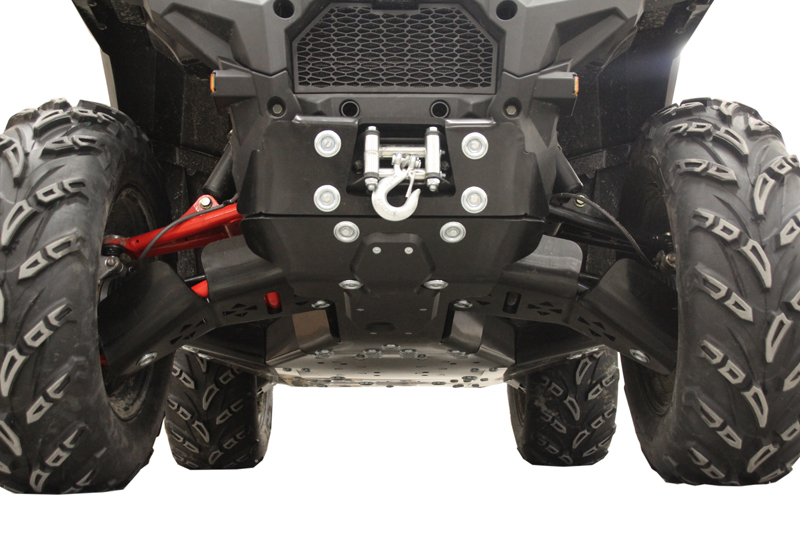 Front lower part of the skid plate must be removed in order to use the Polaris OE "Glacier III" snow plow system!